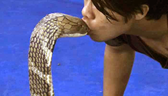 Seorang pemuda berusia 22 tahun asal Thailand memberikan ciuman paling romantis kepada seekor Raja Kobra saat pertunjukkannya di Krabi Snake Farm, Thailand.